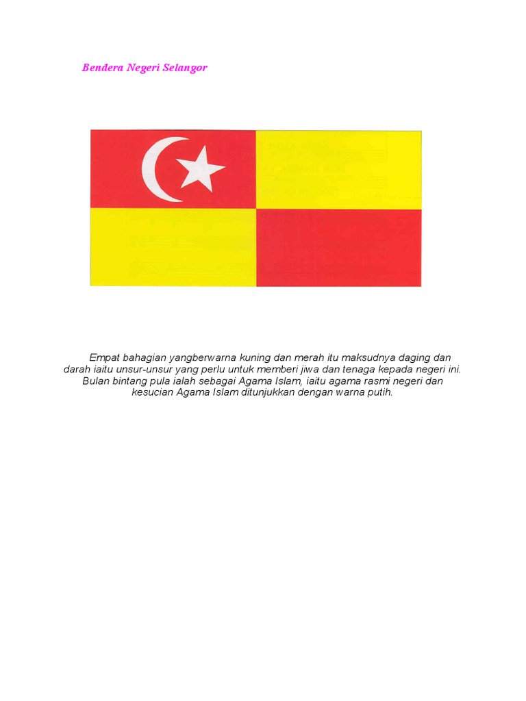 Bendera bersuku menegak berwarna merah dan kuning berlambangkan anak bulan dan bintang putih pada suku pertama. BENDERA SELANGOR SELANGOR Selangor Darul Ehsan ObjekWarna Maksud Bintang Negeri Islam dan lima Rukun Islam sebagai pegangan utama. Selangor merupakan negeri yang termaju dan terkaya dengan bilangan penduduk terbanyak di Malaysia.